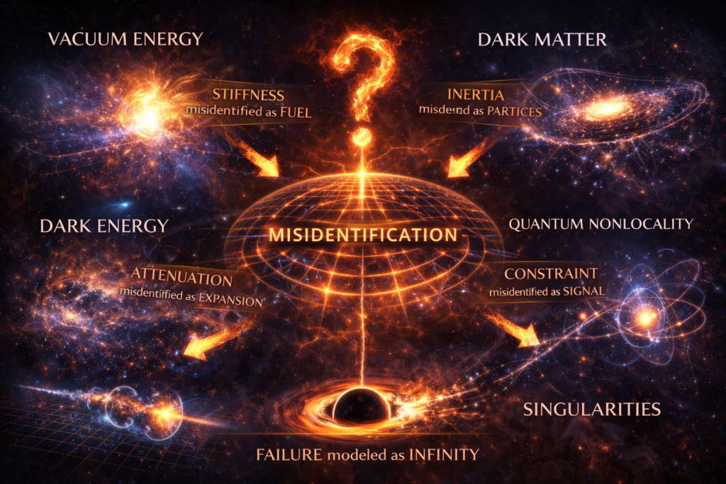Across cosmology, quantum theory, and gravity, we encounter a familiar refrain: anomalies. Dark matter, dark energy, vacuum energy catastrophes, nonlocal correlations, and singularities are treated as unrelated problems, each demanding new entities, new principles, or new mathematics.
